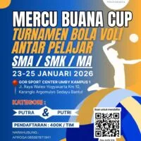 Sedayu.net — Universitas Mercu Buana Yogyakarta (UMBY) akan menggelar Mercu Buana Cup 2026, sebuah turnamen bola voli antar pelajar SMA/SMK/MA yang akan berlangsung pada 23–25 Januari 2026.